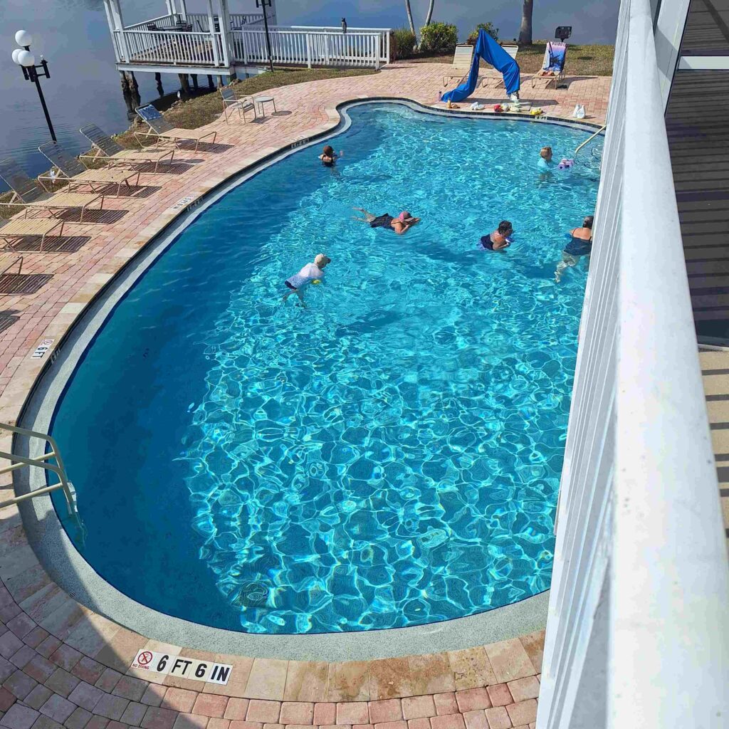 Vicki continues to enjoy the swimming pool and the morning aquatic exercises. V: small class that day, usually 10-12 of us.
