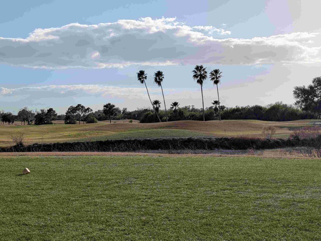 And this area has been in a drought, the rainfall is 10″ below normal since September. This explains all the brown grass, and the water hazards at the golf course were half filled.