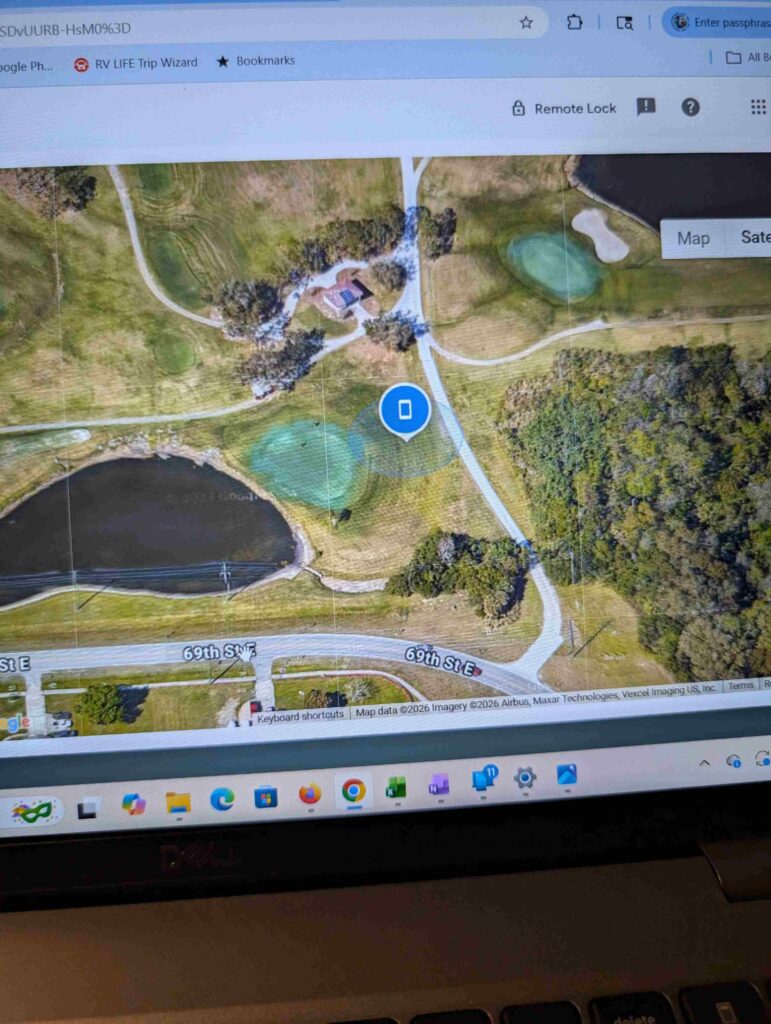 The most adventurous part of the golf game was losing Steve’s phone. We were able to find it on Google (picture of computer screen on left), but when we returned on Wednesday morning the ground crew had already found it. After drying out the phone, it was still working.