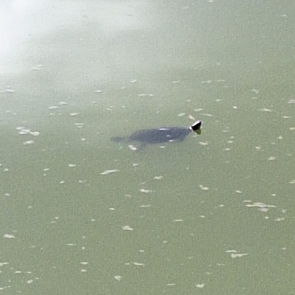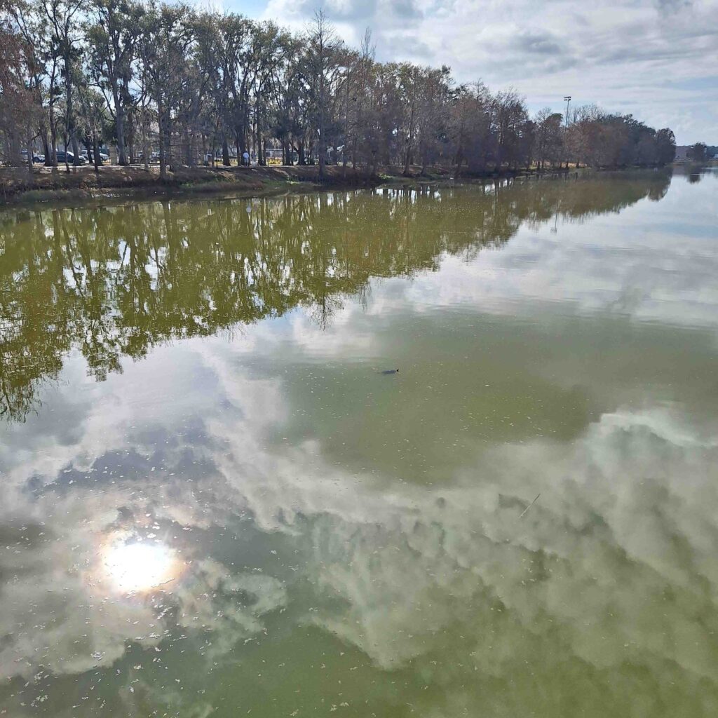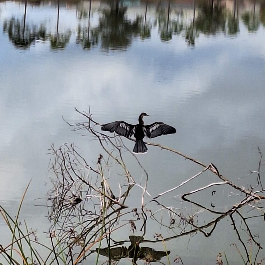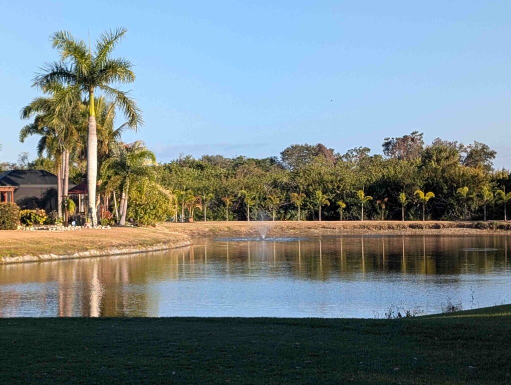 We have seen, or paid attention to, more birds this year than last. Beyond the ibises and vultures, we saw a tri-colored heron on Winter Quarter’s pond. And we have heard and seen wild parrots. One site has a bird feeder, and smaller red-winged blackbirds were feeding there. V: we have a resident alligator at this resort who usually sticks to the pond, although he has been reported strolling around. I understand he’s at least a four-footer in length.