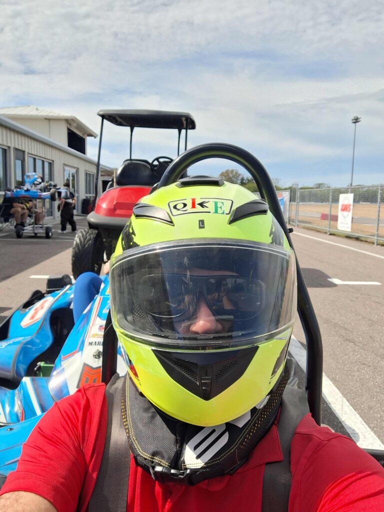 He had to wear a helmet and a neck collar, and getting into the go kart consisted of falling into the seat. Getting out was more challenging, using the seat supports to climb out.