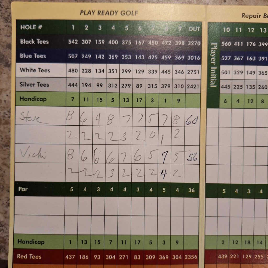 They offered a half price afternoon special, the catch was that we wouldn’t have time to play 18 holes. Which worked for us. V: 9 holes isn’t enough, 18 can be too many. We talked about doing a few more but ran out of time. The links were backed up on every hole. Carts have to be back by 6:20 at the golf courses as the sun was setting by 6:30 pm.