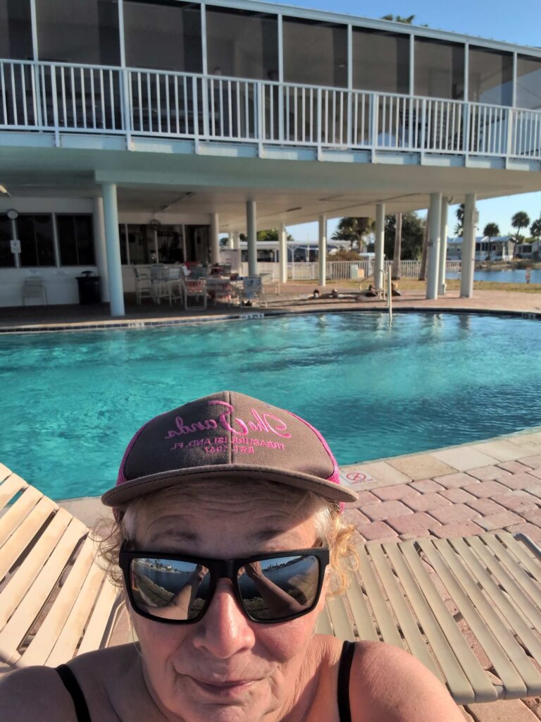 Steven has also gotten a couple more bike rides in. The first, on Monday, just explored the area near Winter Quarters. He had biked along Upper Manatee River Road last year to get some long bike rides in, but this year that road is under construction. Narrow roads with lots of traffic does not mix well with bike riders. V: traffic on 64 is so heavy, I’m good with biking around the resort. We’ll hit a trail soon.