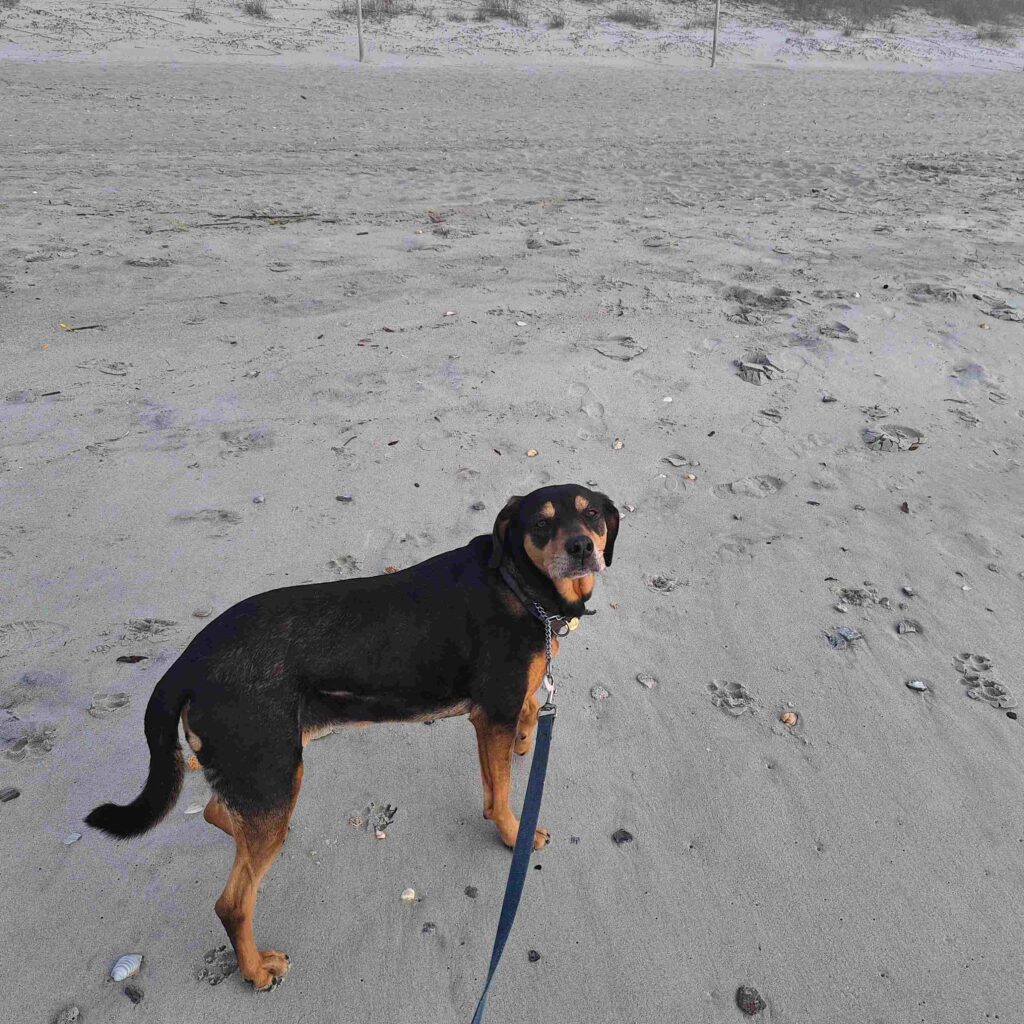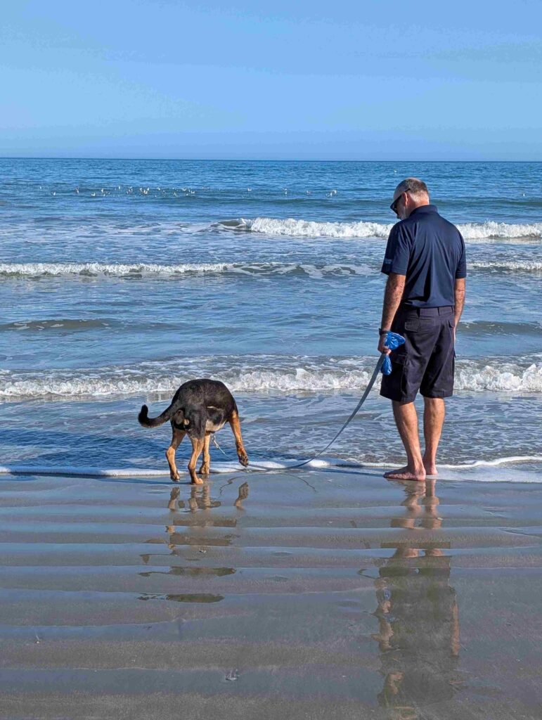 Lexie enjoyed (enjoyed!) walking along the sandy beach. She wasn’t afraid of the waves or water, she just avoided them. Vicki also liked the waves and water, but wasn’t ready to get wet. V: ocean is still pretty cold this far north just into March.