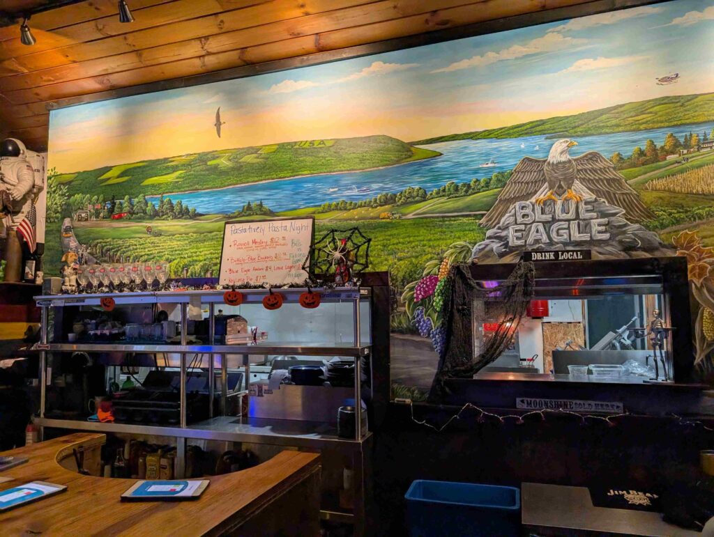 We also enjoyed the food at the Blue Eagle Tavern, V– a homey bar with excellent food, friendly service, a gorgeous mural, and their own label of beer.