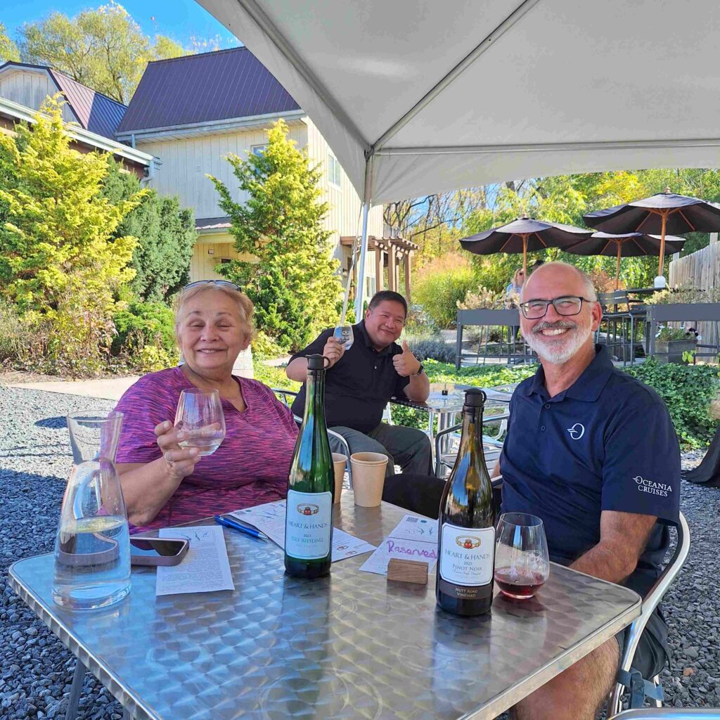 We figured all other nearby waterfalls would also be a bust, so we went looking for wineries instead. And we found Hearts and Hands winery (https://heartandhandswine.com/) that had an outdoor tasting area. Lexie made herself comfortable, and Vicki and I shared a couple flights of their wine. The wine must have been good, we bought four bottles of various vintages (their Arvine, Dry Reisling and Chardonnay). We also enjoyed talking to the other tasters: the couple that was there before us recognized the Oceania logo on Steve’s golf shirt. They have been cruising on Oceania for 14 cruises; they obviously liked the line. V. – Very fun comparing notes with the fellow cruisers and very different doing it at a winery in upstate New York.