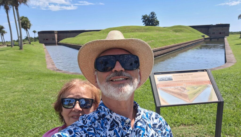 Steve and Vicki took a mid-week trek from Hilton Head to Fort Pulaski, outside of Savannah to add another stamp to our National Park passport book.https://www.nps.gov/fopu/index.htm. The ride to Savannah was mostly on backroads, but all roads lead to the Savannah River (and the bridge that crosses it). The bridge is high so that cruise ships can get under it.